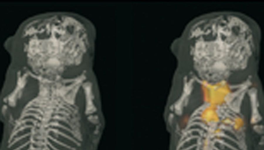 Gerade bei krankhaft verändertem Gewebe ist es wichtig, seine genaue Lage im Organ zu kennen. Diesem Ziel sind Prof. Vasilis Ntziachristos und Prof. Martin Hrabé de Angelis und ihre Mitarbeiter vom Helmholtz Zentrum München und der Technischen Universität München einen entscheidenden Schritt näher gekommen: Sie kombinierten Computertomografie (CMT) und Fluoreszenztomographie (FMT) und bekamen dadurch wesentlich bessere Ergebnisse als mit den einzelnen Methoden. Bei lebenden Mäusen war es so möglich, Lungenkrebs zu diagnostizieren und das Knochenwachstum zu beobachten.