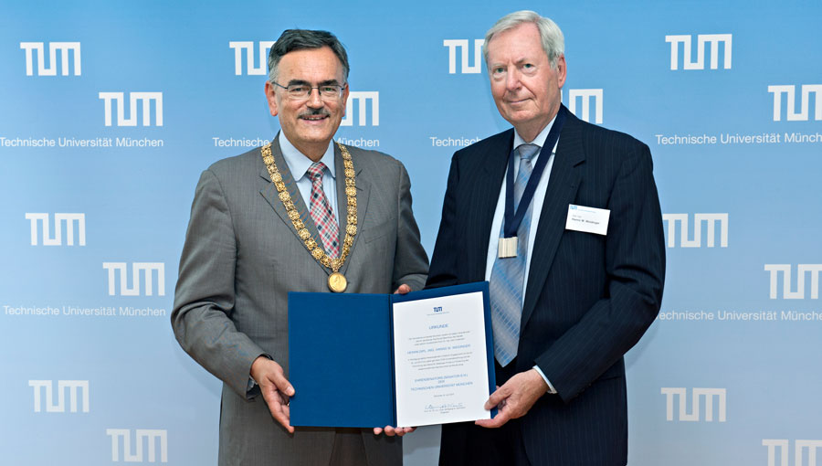 Dipl.-Ing. Hanns W. Weidinger ist sein Leben lang eng mit der TUM verbunden, wo schon sein Vater mit dem berühmten Flugzeugkonstrukteur Willy Messerschmidt zusammenarbeitete. Hier studierte er Elektrotechnik und nahm über das Studium hinaus am Universitätsleben teil. Für die damalige Marionettenbühne der Hochschule, die „Spieldose“, übernahm er Technik und Beleuchtung. Seine Frau Barbara lernte er an der Universität kennen – und machte ihr einen Heiratsantrag im Hörsaal 1100.
