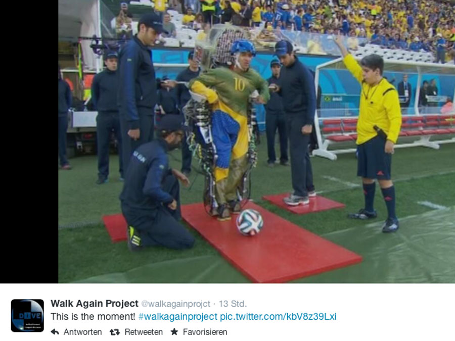 - cbs.com: World Cup 2014: First kick made by mind-controlled exoskeleton, 12. Juni 2014