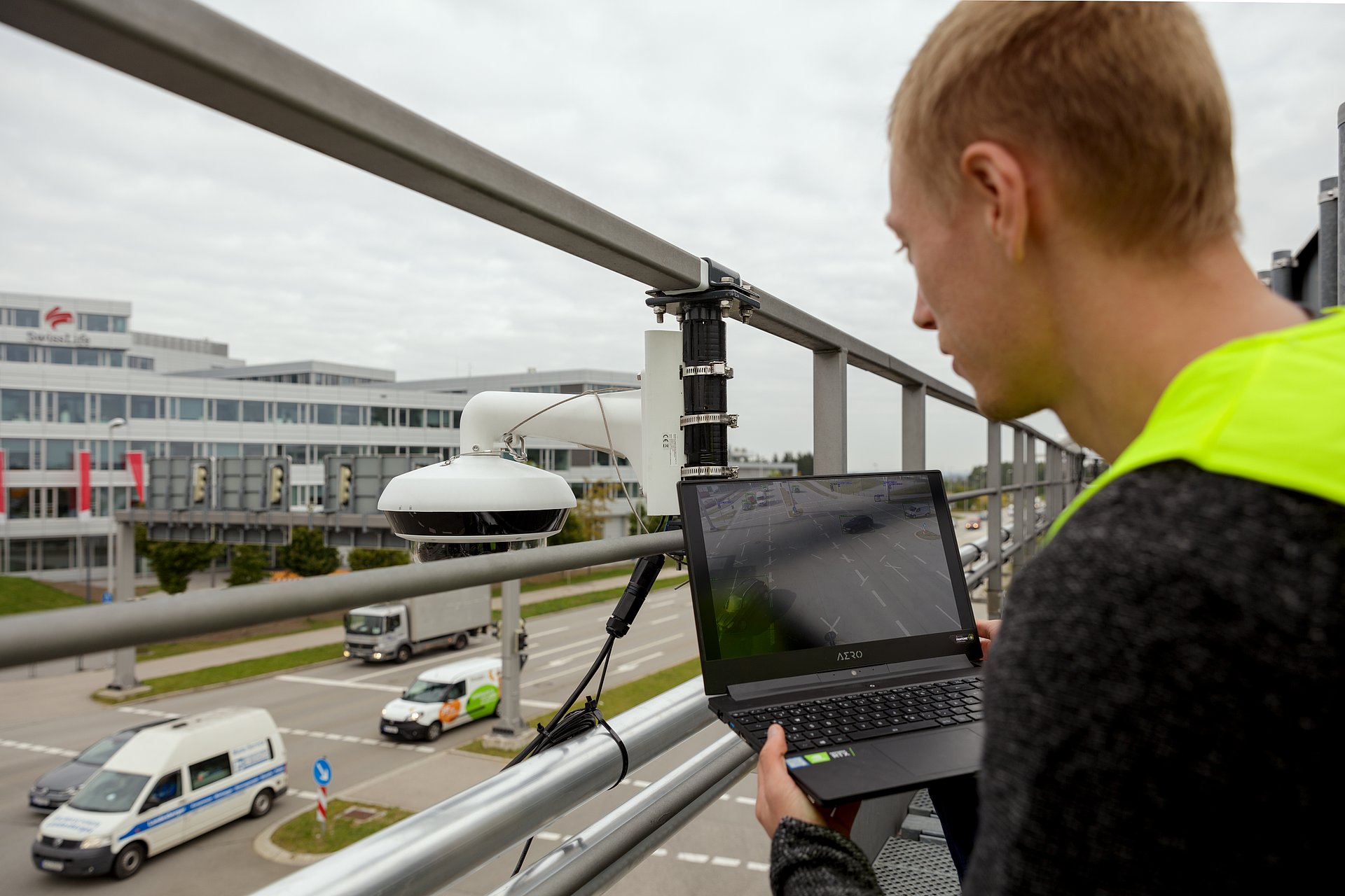 Die Sensoren, die auf Schilderbrücken und Masten in etwa zehn Metern Höhe angebracht sind, liefern von dort oben einen sehr guten Überblick über das aktuelle Geschehen auf der Straße. Dabei erfassen sie die genauen Positions- und Geschwindigkeitsdaten jedes Verkehrsteilnehmers. Eine KI klassifiziert die Objekte und stellt dann anhand dieser Daten einen digitalen Zwilling her, also ein virtuelles Abbild des realen Verkehrsgeschehens.