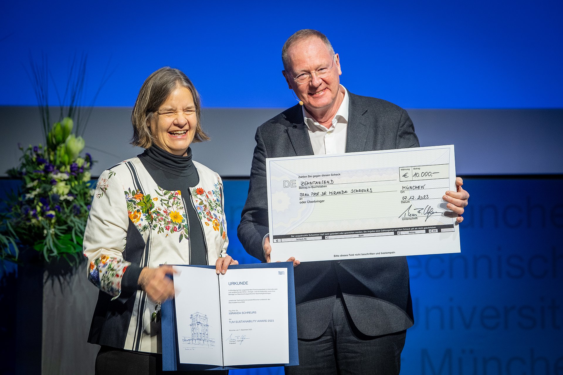 Den Nachhaltigkeitspreis TUM Sustainability Award erhielt die Politikwissenschaftlerin Prof. Miranda Schreurs. Die TUM-Professorin befasst sich an der Hochschule für Politik mit Klimapolitik. Vizepräsident Prof. Werner Lang, im vergangenen Jahr selbst noch der Preisträger, hob Schreurs` Rolle bei der Suche nach Lösungen hervor.