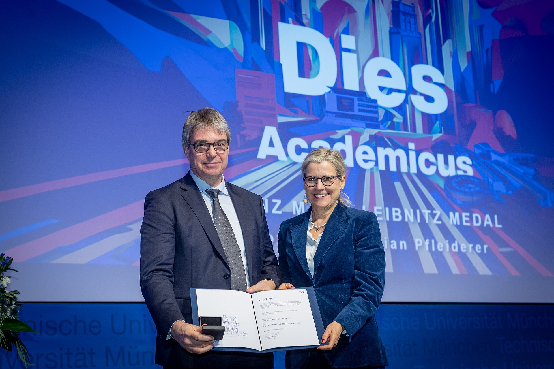 Ebenfalls mit der Heinz Maier-Leibnitz-Medaille wurde der Experimentalphysiker und wissenschaftliche Direktor des Forschungsreaktors FRM II, Prof. Christian Pfleiderer, geehrt. Vizepräsidentin Prof. Juliane Winkelmann sagte, damit werde seine herausragende Forschung in der Festkörperphysik ebenso gewürdigt wie sein Beitrag zur Gründung des TUM Zentrum für QuantumEngineering (ZQE).