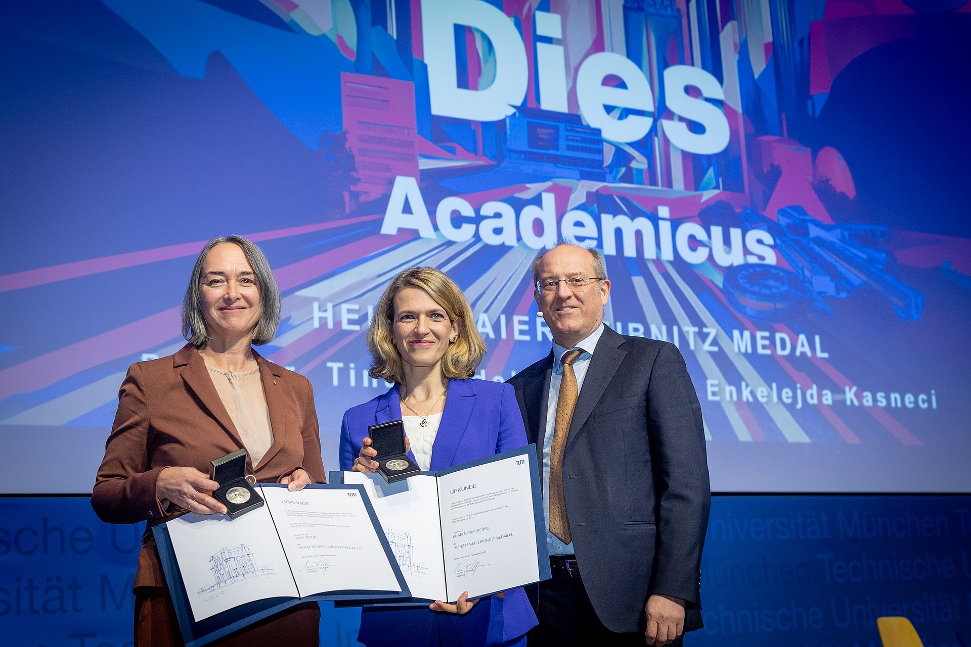 Mit der höchsten wissenschaftlichen Auszeichnung der TUM, der Heinz-Maier-Leibnitz-Medaille wurden die Professorinnen Tina Seidel und Enkelejda Kasneci geehrt. Vizepräsident Prof. Gerhard Kramer begründete dies mit der Etablierung des TUM Center for Educational Technologies (EdTech Center). Die Psychologin und die Informatikerin forschen gemeinsam zum Einsatz von KI in der Lehre und beim Lernen. Inzwischen wurden ihre neu entwickelten Tools von über 100.000 Personen genutzt.