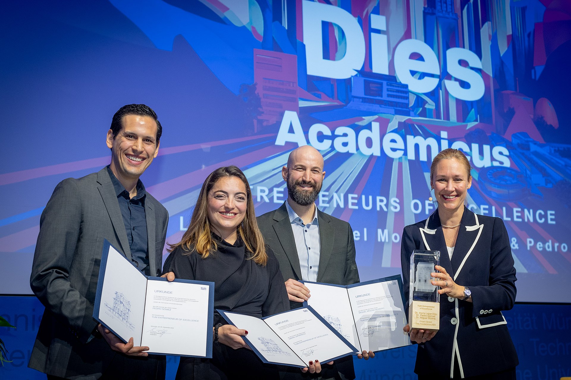 Als TUM Entrepreneurs of Excellence wurden Maria Laparidou, Pedro Gómez und Miguel Molina Romero vom Start-up Orbem gewürdigt. Sie haben ein Bildgebungsverfahren entwickelt, das das Geschlecht von Embryonen im Ei bestimmt und damit das Töten sogenannter Eintagsküken verhindert. Laparidou bedankte sich bei Vizepräsidentin Prof. Claudia Peus für die Auszeichnung und die „große Unterstützung“ als Gründerteam durch die TUM. Laparidou bedankte sich bei Vizepräsidentin Prof. Claudia Peus für die Auszeichnung und die „große Unterstützung“ als Gründerteam durch die TUM.