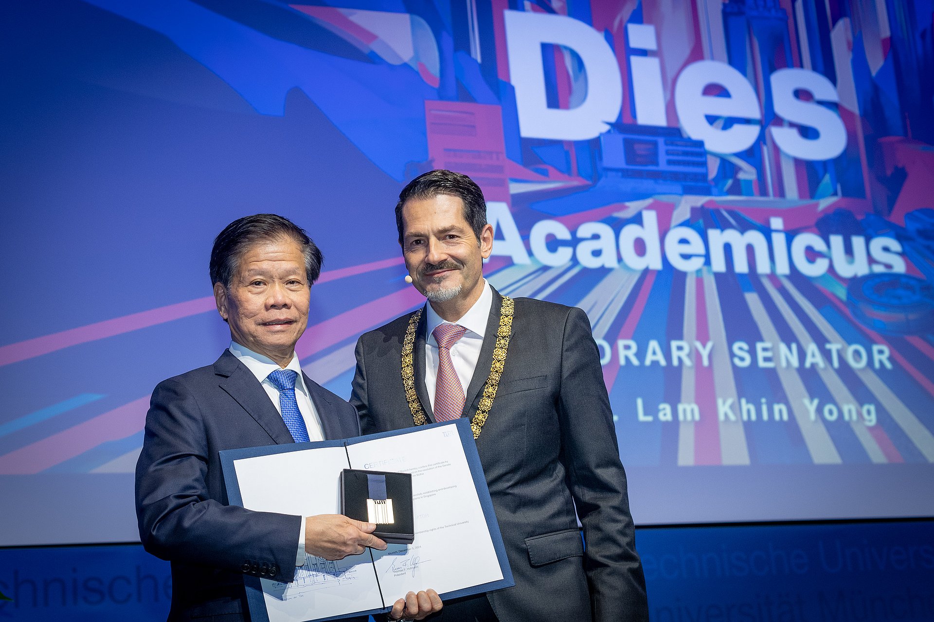 Prof. Lam Khin Yong, Vize-Präsident der Nanyang Technological Universität (NTU) in Singapur, wurde für seine Verdienste als ausdauernder Unterstützer des Campus TUM Asia zum Ehrensenator der TUM ernannt. Präsident Hofmann würdigte den unermüdlichen persönlichen Einsatz von Prof. Lam für die Zusammenarbeit von NTU und TUM, die in 2024 in der Unterzeichnung einer Flaggschiff-Partnerschaft beider Hochschulen gipfelte.