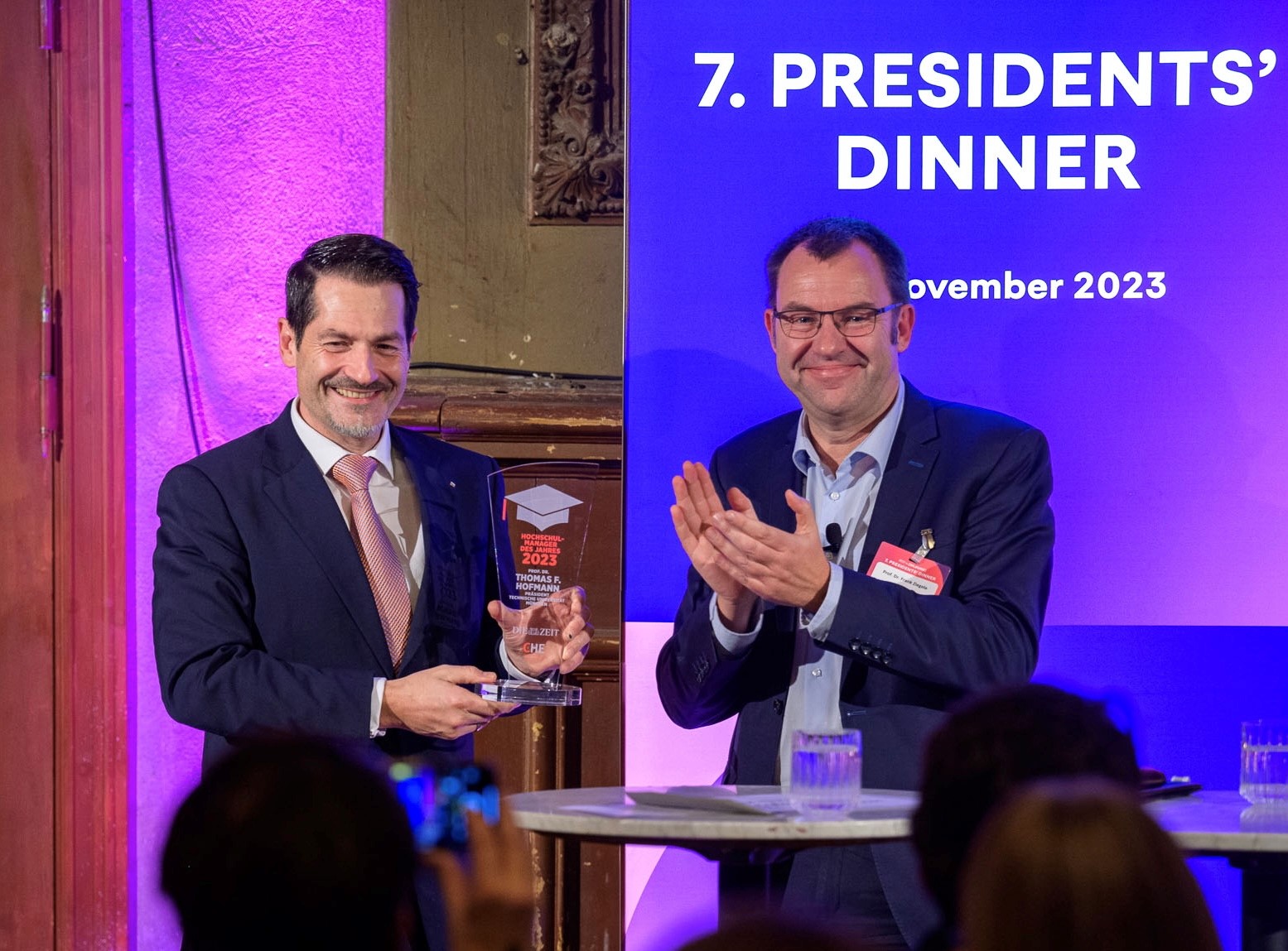 Thomas F. Hofmann bedankte sich bei der Jury für die Anerkennung: „Ich nehme den Preis dankend entgegen, stellvertretend für unsere engagierte TUM-Familie. Ich empfinde diesen Preis als Würdigung der vielen Veränderungen, mit denen ich gemeinsam mit den Studierenden, Mitarbeitenden sowie Kolleginnen und Kollegen die TUM noch wirksamer auf die künftigen Herausforderungen ausrichten will. Das ist weniger eine Auszeichnung für meinen eigenen Beitrag, denn vielmehr für die Agilität und Leistung unserer Universitätsgemeinschaft insgesamt. Den vielen Menschen in Forschung, Lehre, Innovation und Verwaltung danke ich sehr für Ihren persönlichen Einsatz, Ihre Belastungsfähigkeit, Flexibilität und Ihren Pragmatismus.“