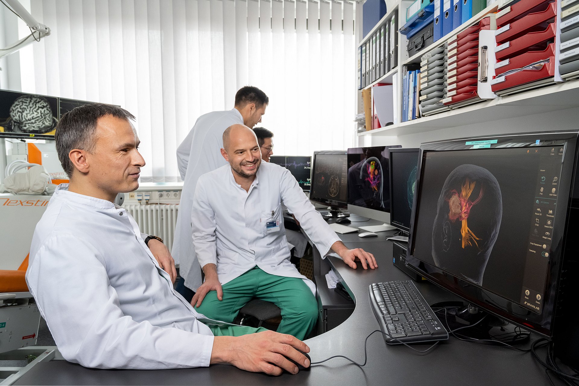 Die TUM-Wissenschaftler Dr. med Haosu Zhang und Dr. med. Sebastian Ille haben nun Schichtbilder vom Gehirn anatomisch zugeordnet, die für sprachliche Fähigkeiten zuständig sind. Der Ablauf ist Folgender: „Mit Hilfe einer speziellen Form der Magnetresonanztomographie, der sogenannten Traktografie stellen wir die Netzwerke und Subnetzwerke von Nervenbahnen im Gehirn dreidimensional dar“, erläutert Zhang die Technologie.