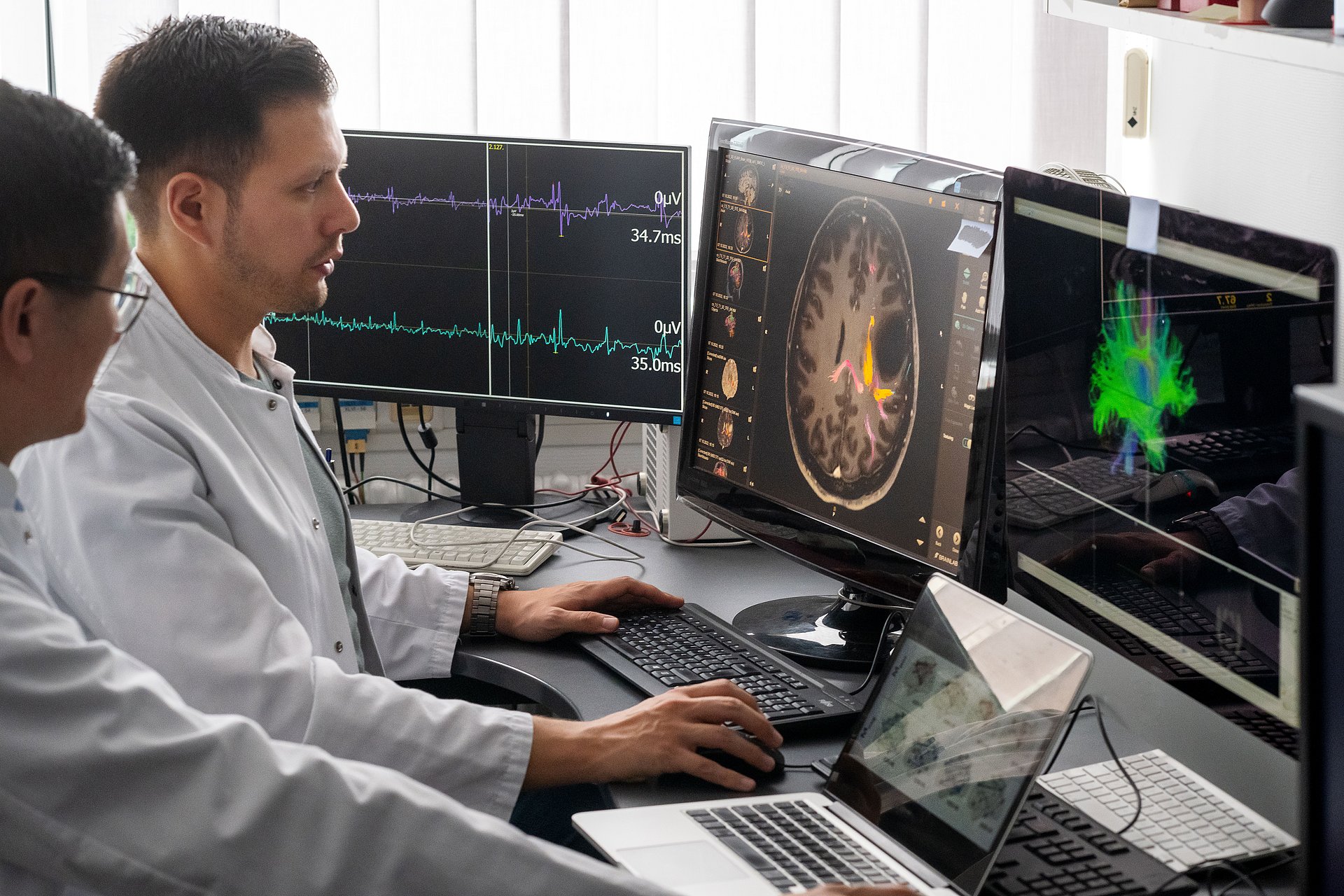 Unterstützt wird diese Netzwerkanalyse von der navigierten transkraniellen Magnetstimulation. Dabei hemmt ein gezielter magnetischer Impuls Nervenzellen von Faserbahnen, die für das Sprechen zuständig sind. Dies löst dann bei den Patient:innen eine vorübergehende Sprachstörung aus, die in Videoanalysen erkannt werden kann. So können die Wissenschaftler:innen präzise Regionen im Gehirn ausfindig machen, die für das Sprechen zuständig sind. „Die so genannten Connectom-Parameter aus der Traktografie und Informationen über die Sprachfunktion des Patienten kombinieren wir miteinander“, erläutert Zhang.