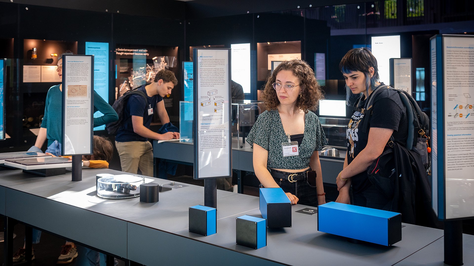Auch außerhalb der Museumsmauern engagiert sie sich für die Vermittlung des Themas und ist im Student Club PushQuantum aktiv. Dieser bietet Studierenden verschiedener Fachrichtungen einen praxisnahen Einblick in die Quantentechnologien und fördert den Austausch mit Expertinnen und Experten aus Industrie und Forschung. „So wird Wissenschaft lebendig und greifbar“, sagt Paula García-Mochales. Im Anschluss an die Führung diskutiert sie mit den anderen in der Gruppe über die Ausstellung und Verbesserungsmöglichkeiten.