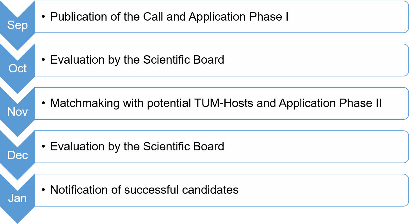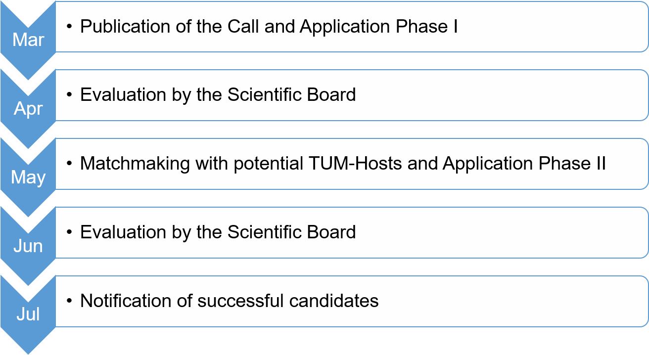 In each call, there are two phases. In Phase I, you do not require to submit a letter of support from a TUM host. However, you must identify a TUM host, who will support your application, during Phase II of the submission process. See below for further information on these two phases.