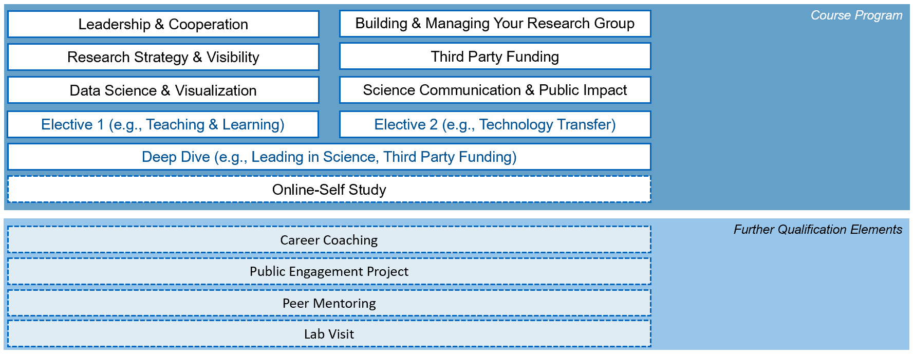 Additionally participants choose two topics according to their interests within the framework of two elective modules ("Electives"), for example teaching, technology transfer or research management.