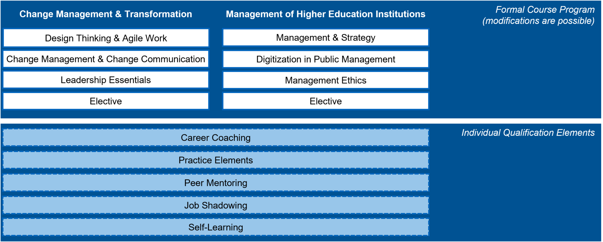 The target audience is primarily persons in staff and interface functions, persons with design, control, and management tasks in the schools and their chairs or in central (scientific) institutions as well as in academically shaped fields of activity in the administration, who regularly face changes and (want to) actively shape them. There is no age limit for applications.