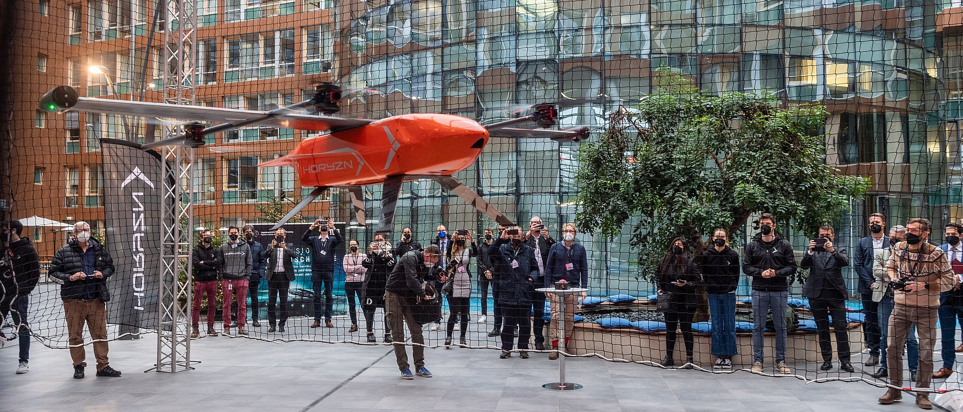 With the help of the Bavarian Red Cross and a simulated emergency, the HORYZN team was able to demonstrate the technical capabilities of their prototype with a test flight in Ottobrunn on Wednesday. The demonstration was watched by TUM President, Prof. Thomas F. Hofmann, alongside Bavarian Science Minister Bernd Sibler and other guests.