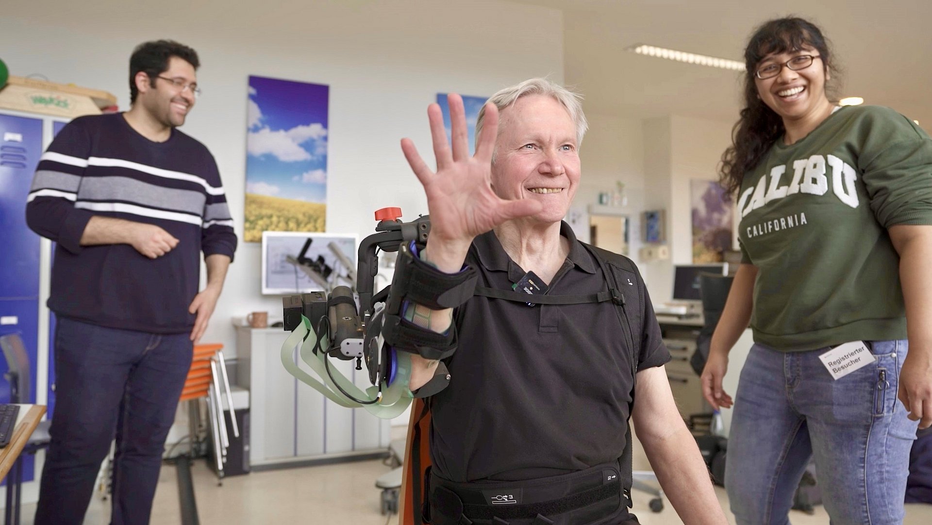 The researchers use functional electrical stimulation (FES) to stimulate specific muscles in the forearm. This is necessary, for example, for moving fingers, grasping objects or catching a ball. However, one-sided paralysis following a stroke usually affects not only the hand, but the entire side of the body. For that reason, a scaffold also supports the entire arm up to the shoulder.