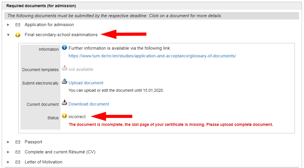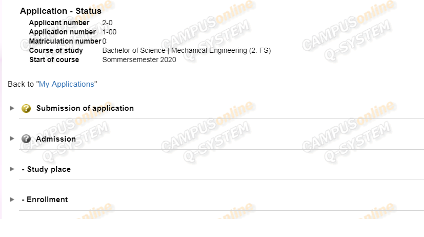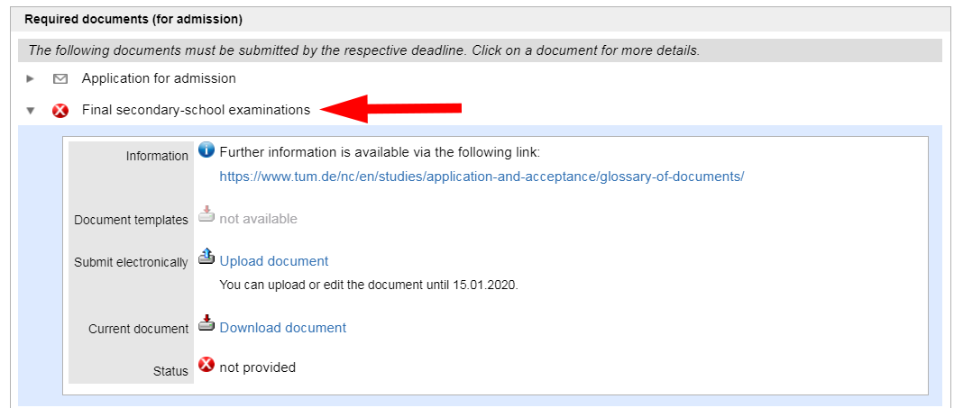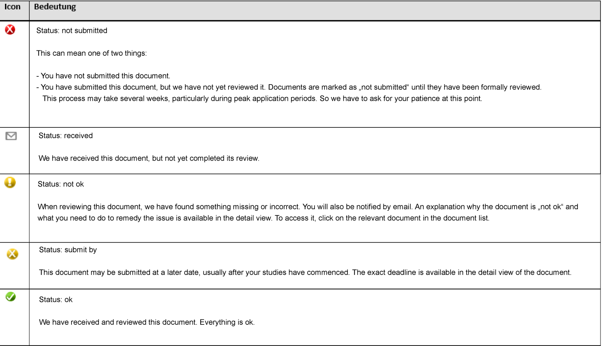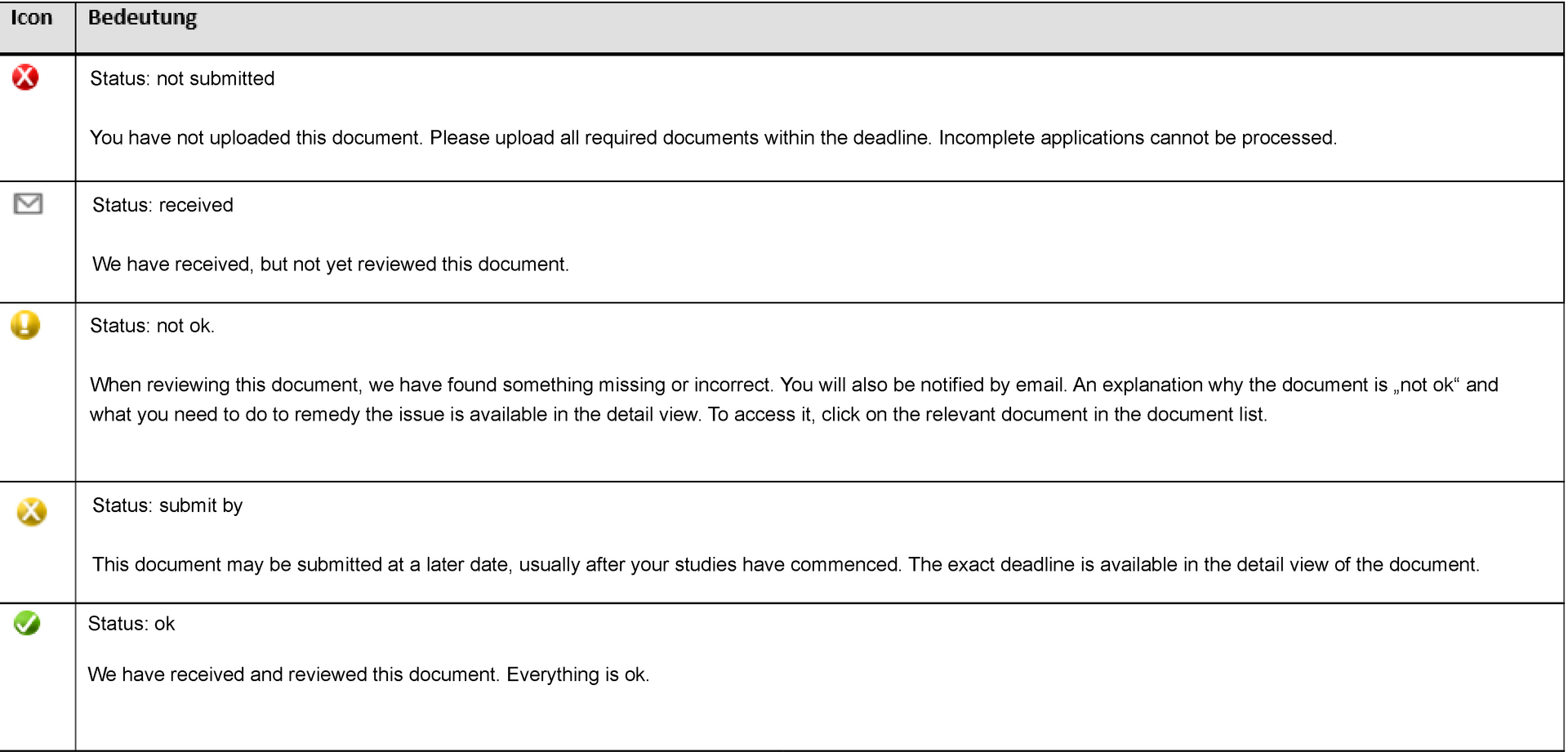 First, the status of your electronic (online) application. Second, the status of your application documents, which are required for admission. Directly beneath the Status section, you will find a list of all required documents for admission. This status view will switch to “ok” as soon as the status of each required document (see 1.2) is “ok”.