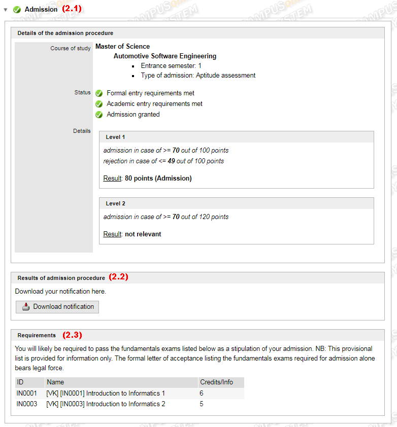 In the section Details of the admission procedure (2.1) you can find out if you fulfill the admission requirements for your desired degree program under “Status”.