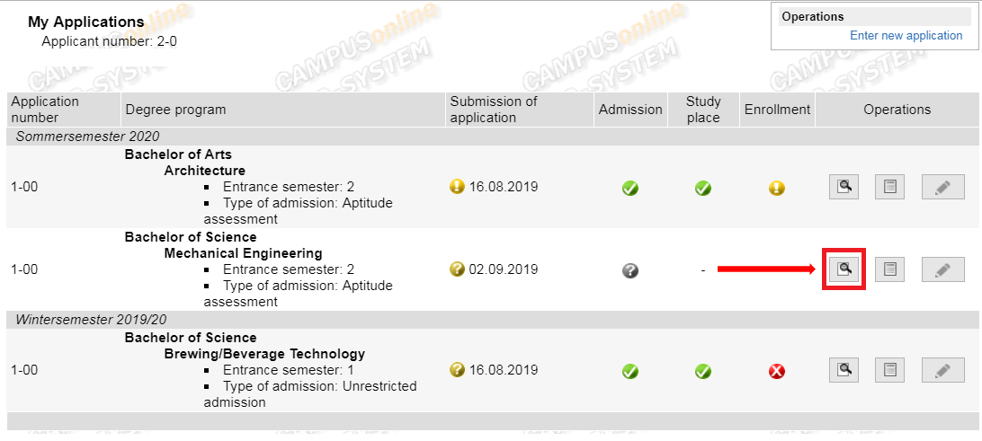 TUMonline provides detailed information on the status of your application. You can navigate to the relevant status overview by clicking on the magnifying glass icon. The icon is activated once you have submitted your online application.