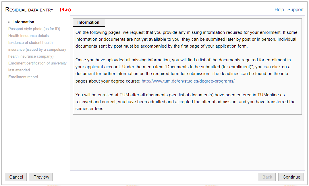 You can upload any documents relevant for enrollment that do not need to be provided as authentic documents (e.g. a current passport-style photo or proof of student health insurance) under Residual Data Entry (4.5). To do so, click on the button Add data in the Next steps section (4.1). You may only upload additional data once.