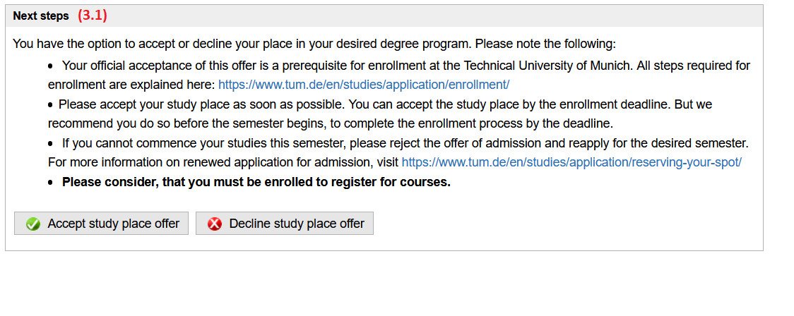 If you have received an offer of admission, you can officially accept or decline the offer under Next steps (3.1) by clicking on the button “Accept study place offer”. You can only enroll at the university after you have officially accepted the offer of admission.