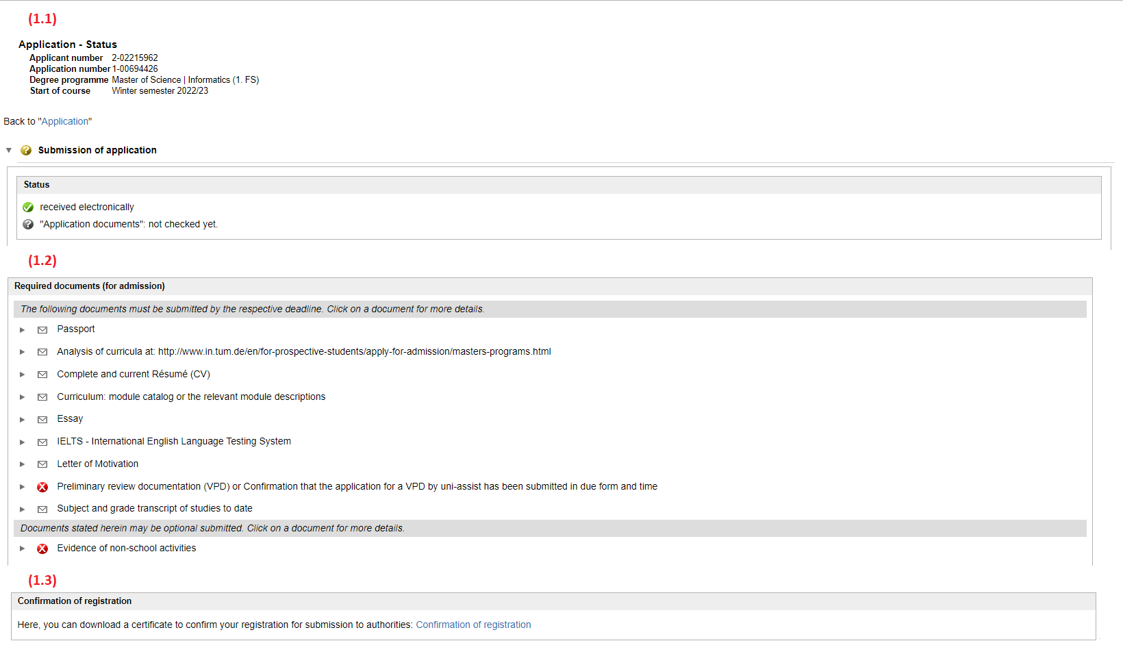 After submitting your application, you can see whether your documents were uploaded on time, or if any documents have not yet been uploaded. If you require verification for a public authority that you have submitted an application for admission to university, you may download it under Confirmation of registration (1.3).