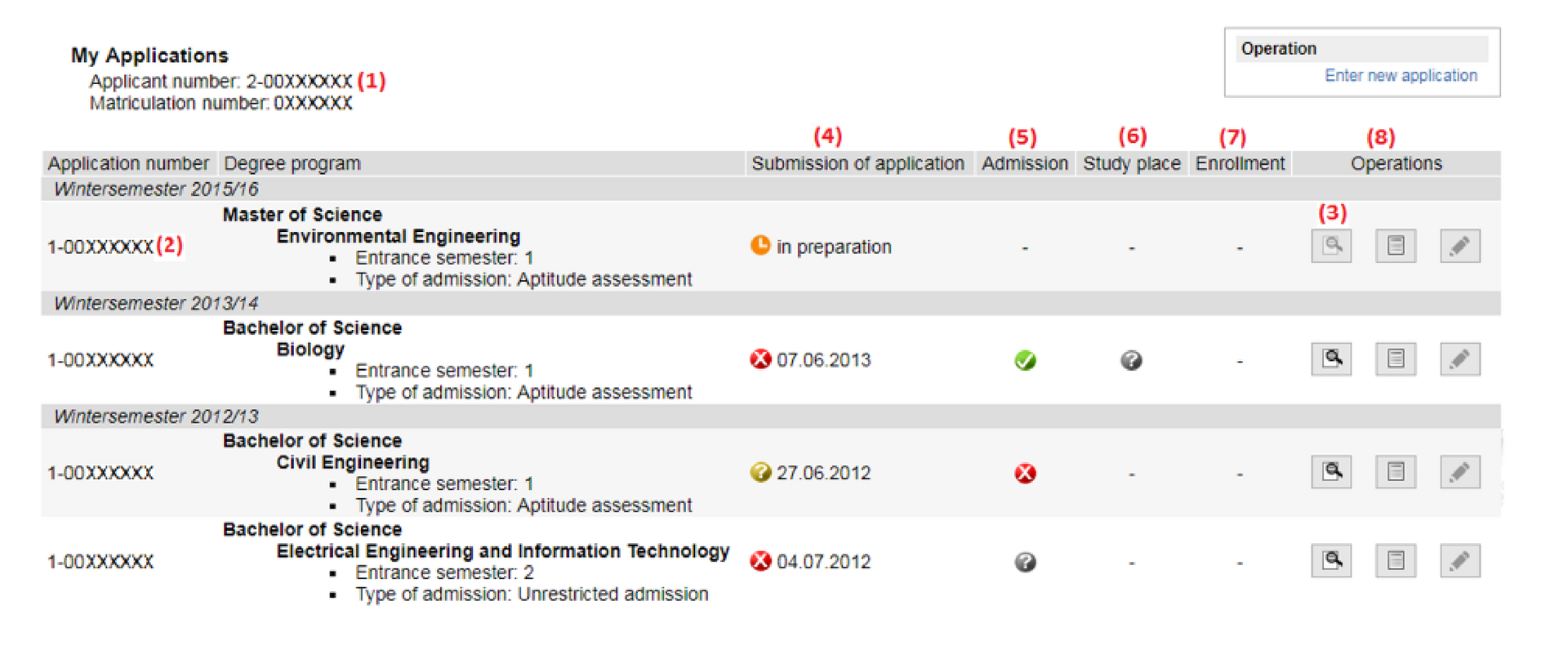 Here, you will find your applicant number (1), a list of your applications and the respective application number (2). You will find information on the status of each application you have submitted. There are various types of status, which are explained in detail below.