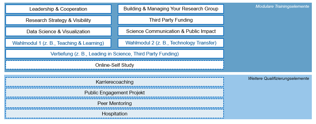 Teilnehmende wählen im Rahmen von zwei Wahlmodulen („Electives“) nach Interesse zwei Themen, beispielsweise Lehre, Technologietransfer oder Forschungsmanagement. Vertiefungsmodule („Deep Dives“) ermöglichen eine persönliche Schwerpunktsetzung auf diejenigen Schlüsselkompetenzen aus den Pflichtmodulen, die Sie gezielt vertiefen möchten, bspw. Drittmittelmanagement oder Führung in der Wissenschaft.