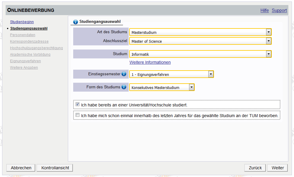 In diesem Schritt geben Sie Ihre Masterzugangsberechtigung an. Er erscheint daher nur bei der Bewerbung für Masterstudiengänge.