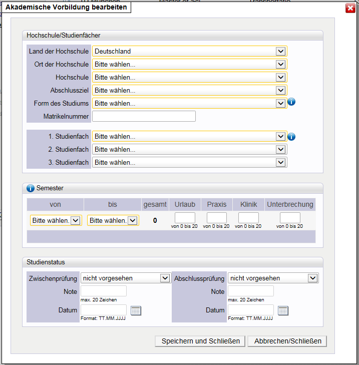 Die Angaben unter Semester beziehen sich auf die Dauer des entsprechenden Studiums. Die Anzahl Ihrer Urlaubs-, Praxis-, Klink- oder Unterbrechungssemester können Sie in den entsprechenden Feldern eintragen. Andernfalls lassen Sie diese Felder leer.
