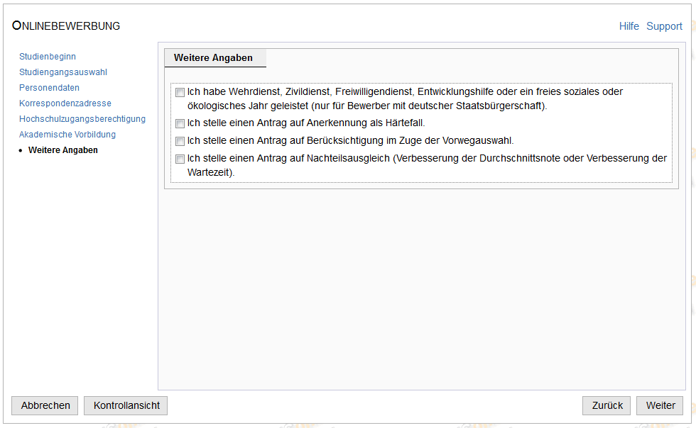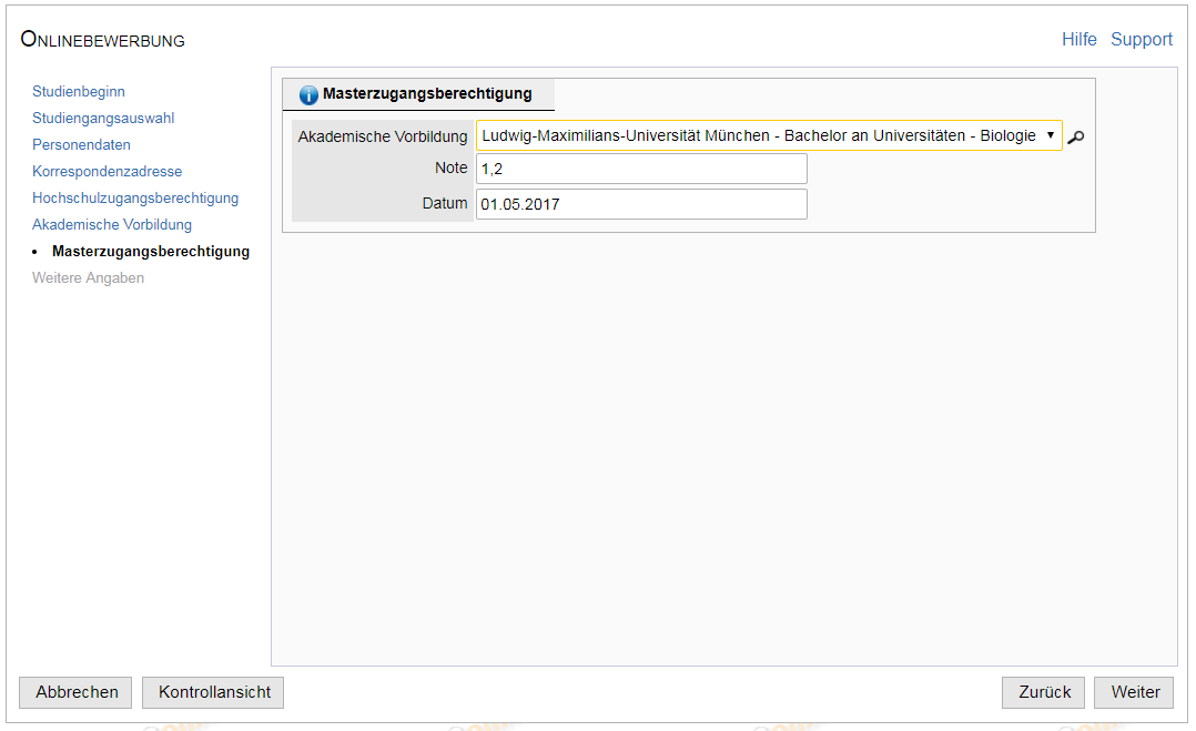 In diesem Schritt geben Sie Ihre Masterzugangsberechtigung an. Er erscheint daher nur bei der Bewerbung für Masterstudiengänge.