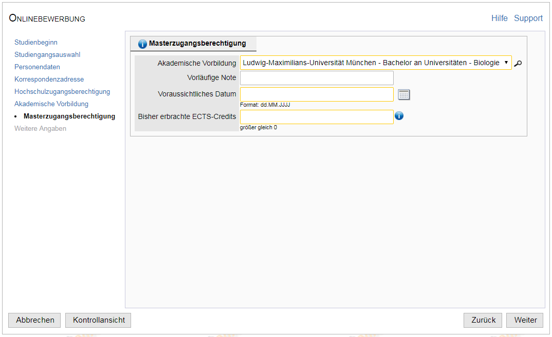 Wenn die akademische Vorbildung, also z.B. Ihr Bachelorstudium, noch nicht abgeschlossen ist, dann geben Sie das voraussichtliche Datum des Abschlusses, die bisher erbrachten ECTS-Credits und, falls bekannt, die vorläufige Note des Abschlusses an.