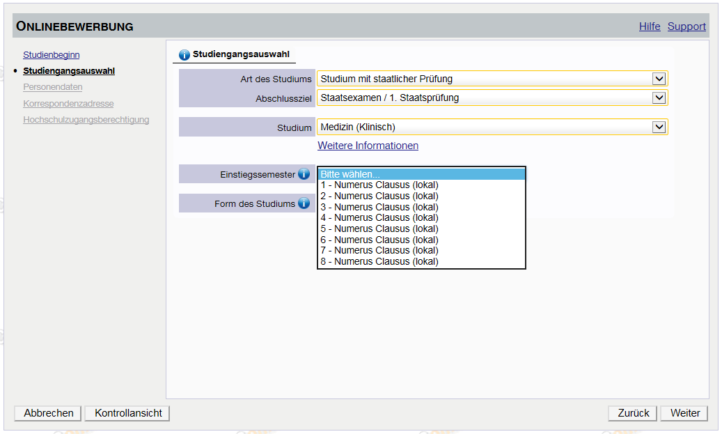 In allen übrigen Fällen handelt es sich in der Regel bei der Bewerbung für Medizin (klinisch) um das 1. Einstiegssemester. Wenn Sie sich für ein Studium mit einem Numerus Clausus (lokal) bewerben, wird dieses neben dem Einstiegssemester automatisch angezeigt.
