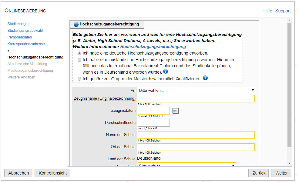 In diesem Schritt geben Sie Ihren höchsten allgemeinen Schulabschluss an, der den Zugang zum deutschen Hochschulsystem erlaubt. In den übrigen Feldern tragen Sie die weiteren Informationen aus Ihrer Hochschulzugangsberechtigung ein.