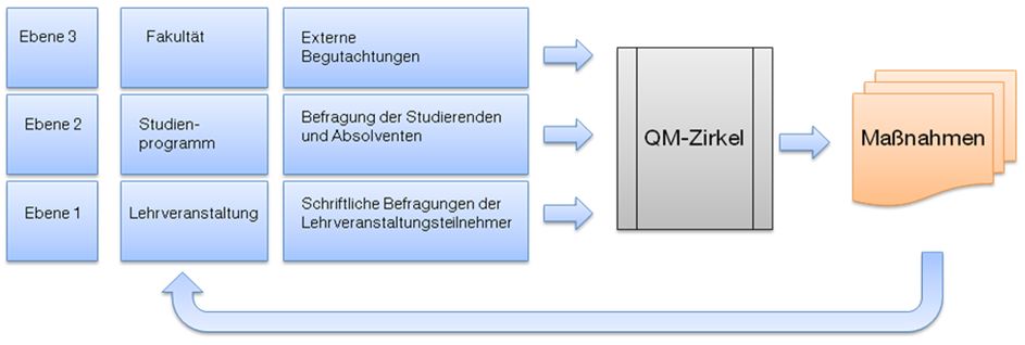 Die Auswertung der erhobenen Daten werden in einem, von jeder Fakultät einzurichtenden Gremium, dem Qualitätsmanagementzirkel (QM-Zirkel), vorgenommen. Im QM-Zirkel werden die Ergebnisse in Form einer Stärken-Schwächen-Analyse dargestellt und diskutiert. Darüber hinaus werden dort die Verbesserungsmaßnahmen beschlossen. Die Umsetzung dieser Maßnahmen wird in den folgenden QM-Zirkeln nachverfolgt.